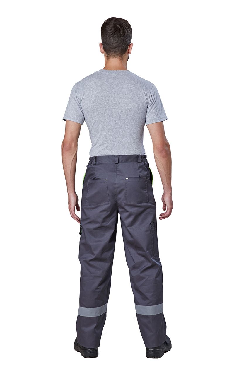 Брюки мужские прямого кроя, с застёжкой гульфика на молнию. Притачной пояс с резинкой по бокам и шлевками. Накладные карманы на левом боковом шве с клапаном с патой на кнопке. Два задних накладных кармана и карман для инструментов.