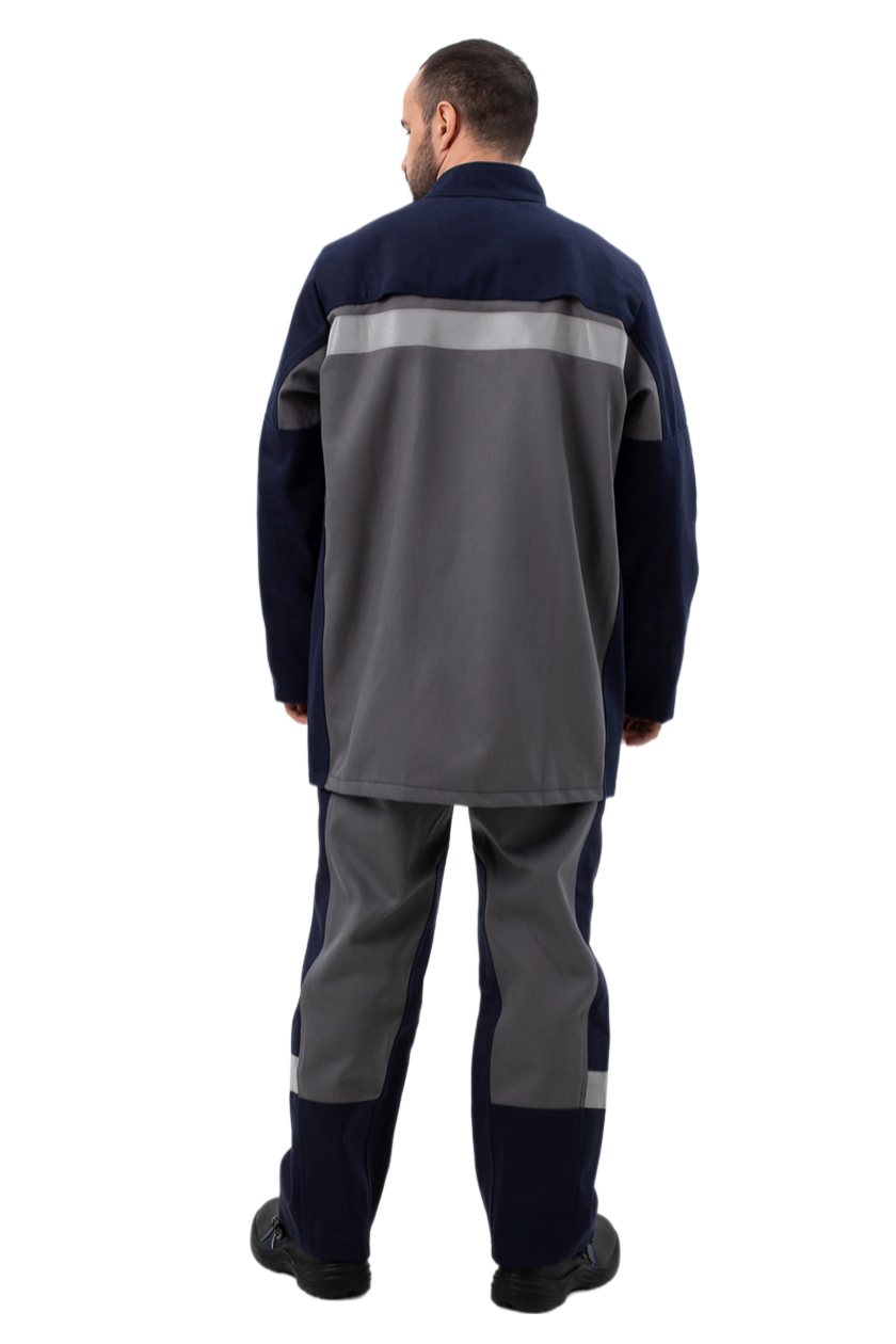 Оптимальный объем костюма исключает излишние заломы ткани и попадание в них искр и брызг. Отделочные строчки выполнены огнестойкими нитками.